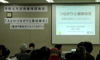 令和元年12月1日(土) 13時30分~15時 布施近隣センター会議室講師 東京大学高齢社会 総合研究機構・特任講師 村山洋史氏 テーマ「人とのつながりと健康格差」~健康の秘訣は人とのつながり~ 資料をもとに、人とのつながりが健康にどう結びつくのかを教えていただきました。