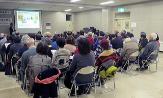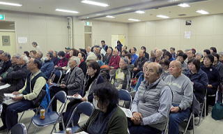 | 40人の参加者は熱心に聞き入っていました。最後に質疑応答もありました。 持参されたビデオプロジェクターが不具合だったので、配布された資料により説明がなされました。 |