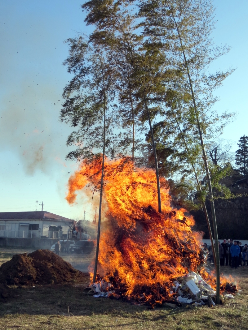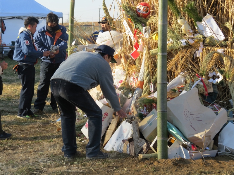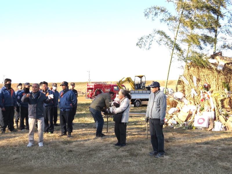平成30年1月14日(日) あけぼの山トマトハウス裏において、お札や正月飾りのお焚き上げが行われました。 今年は、布施連合町会主管・柏市消防団第一方面隊第6、7、8分団共催です。15時点火までの間に、各人が随時持ち込んだ古いお札や書き初めなどを盛り上げ、約80名が見守る中、藤原連合町会長のあいさつに始まり、今年の年男の代表2人により、点火されました。