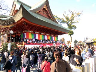 布施弁天 節分・豆まき 平成31年2月3日布施弁天の恒例の節分・豆まきが2月3日13:30から 15:30からの2回、本堂の横で行われました。 事故防止のため、小学生以下と一般と2手に分かれて、年男・年女を含めおよそ30人が、豆や袋菓子、お餅・タオルなどをまきました。