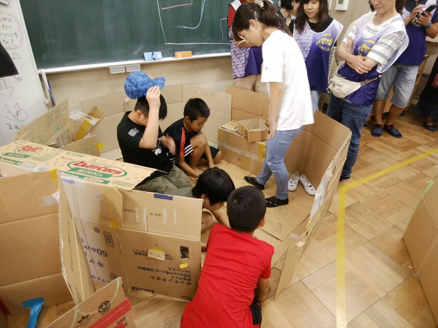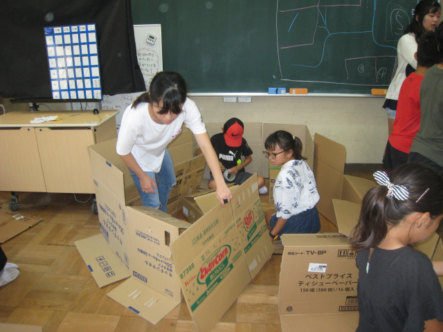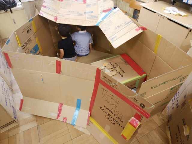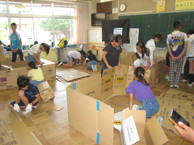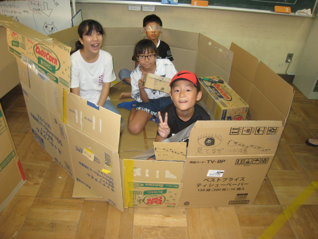 お腹いっぱいになり、帰りのバス内レクでは「なぞなぞクイズ」「手のひら伝言ゲーム」で盛り上がり、伝言の正確さに参加者の皆さんの結束を感じました。 富勢西小学校に着いて、班ごとに分かれ、段ボールハウスを作成しました。夢のマイホーム、コケッコハウス、ダンボール一軒家、K・A家(個人情報なのでイニシャルにしました)、5班の大きな家、ダンボールリラックスハウス。何のことだかお分かりでしょうか? 次のスライドショーをご覧ください。